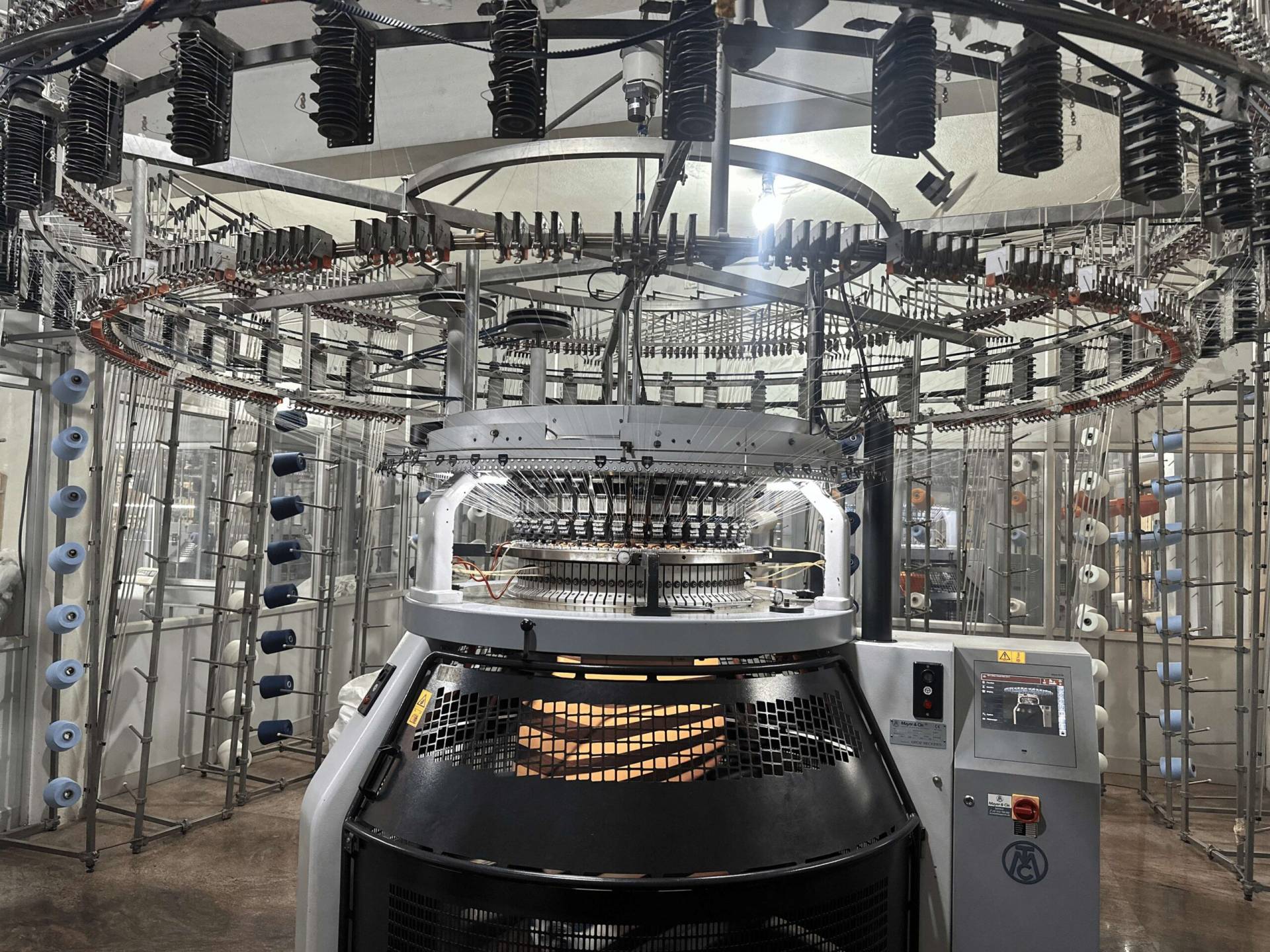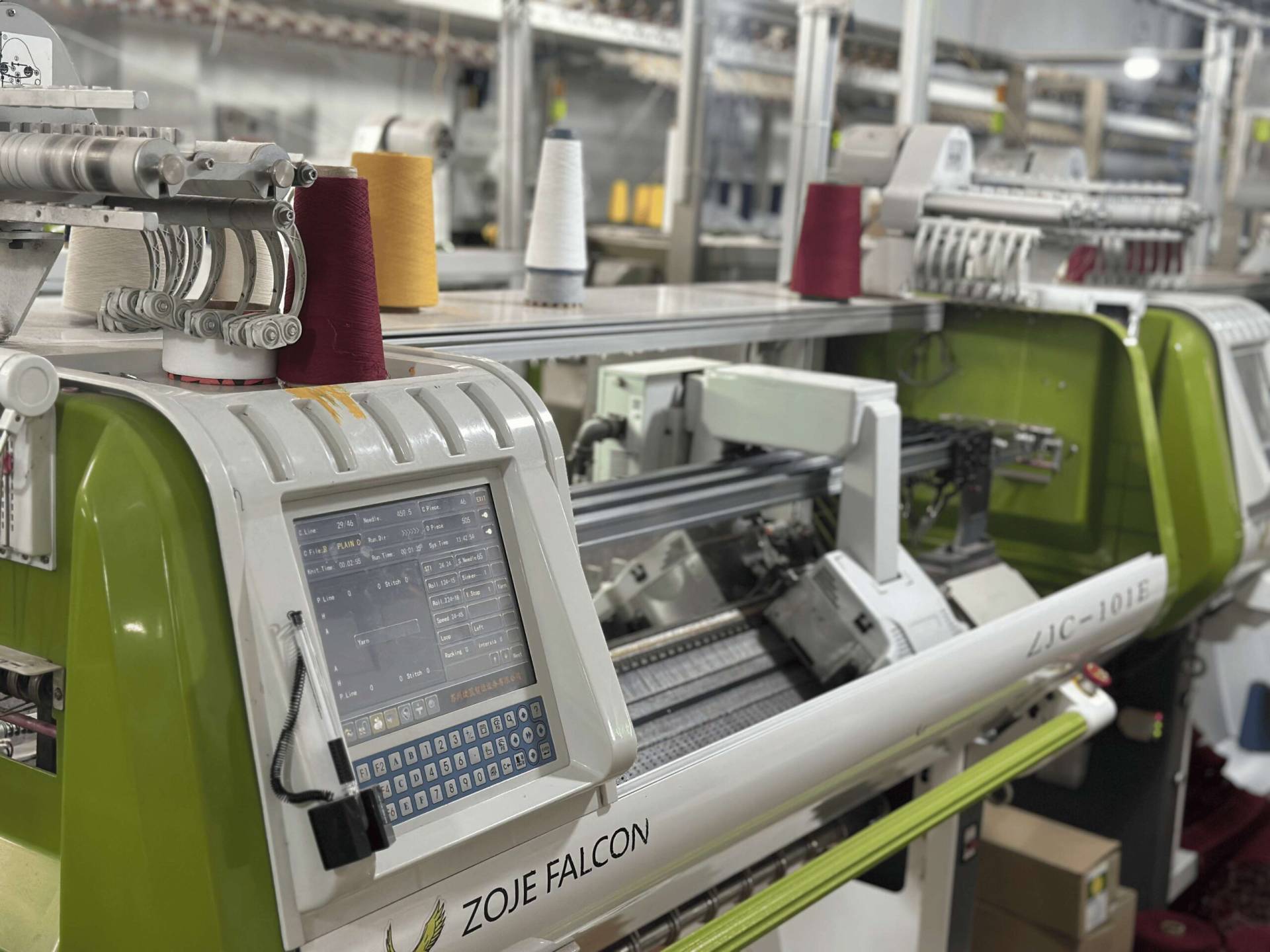 A specialized collar knitting unit using 55 advanced machines to craft high-quality jacquard collars for polos, ensuring consistency, speed, and customization.